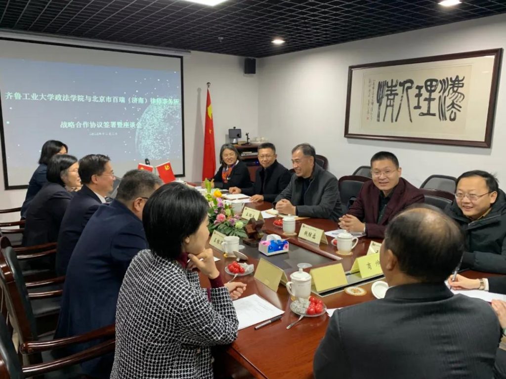 2020年12月2日,齐鲁工业大学政法学院与我所战略合作协议签约仪式在我所会议室隆重举行。齐鲁工业大学政法学院书记王鹏生、副院长宋世勇、法律系钱继磊主任、王华伟副主任、数据与知识产权研究中心执行主任陈洪娟同我所孙志新主任、执行主任王振华律师、高级合伙人张蔚律师、高级顾问王义国律师,合伙人韩洪淼律师、行政主任阚金萍、律师代表亲切会晤,共同出席座谈及签约仪式。