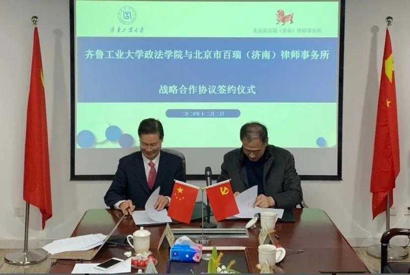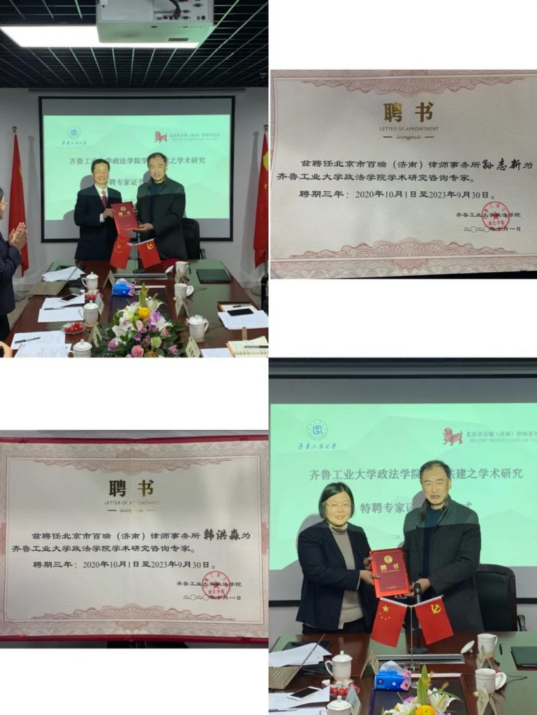 2020年12月2日,齐鲁工业大学政法学院与我所战略合作协议签约仪式在我所会议室隆重举行。齐鲁工业大学政法学院书记王鹏生、副院长宋世勇、法律系钱继磊主任、王华伟副主任、数据与知识产权研究中心执行主任陈洪娟同我所孙志新主任、执行主任王振华律师、高级合伙人张蔚律师、高级顾问王义国律师,合伙人韩洪淼律师、行政主任阚金萍、律师代表亲切会晤,共同出席座谈及签约仪式。