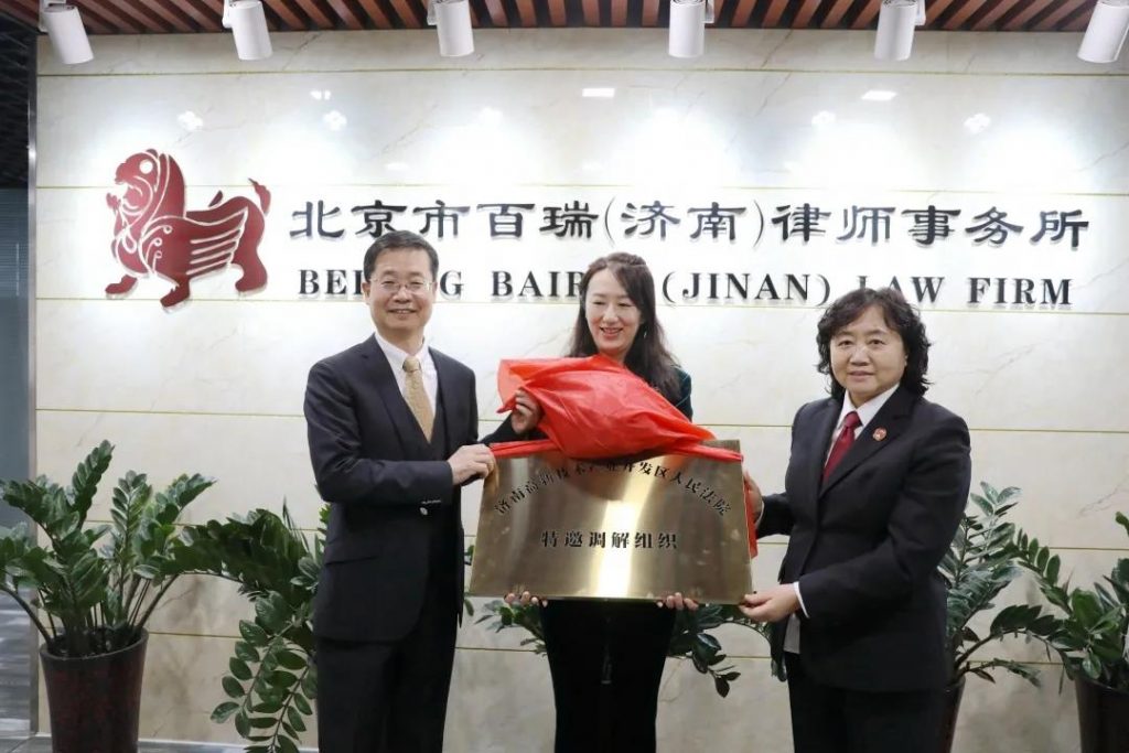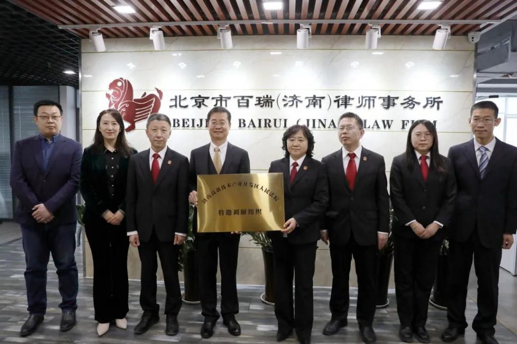 2021年3月5日,济南高新区法院与北京百瑞(济南)律师事务所签约成立“特邀调解组织”,这也是济南高新区法院第五家特邀调解组织。济南高新区法院党组成员、副院长何道云,立案团队负责人王刚一行4人出席揭牌仪式并进行座谈。
